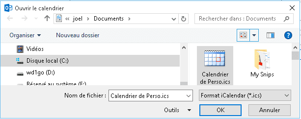 Le destinataire enregistre le calendrier ics reçu dans un dossier puis l'ouvre dans Outlook.