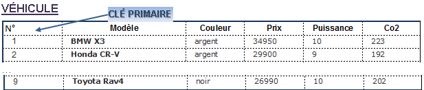 Toute relation doit posséder une clé primaire non nulle (ex : N° dans Véhicule).