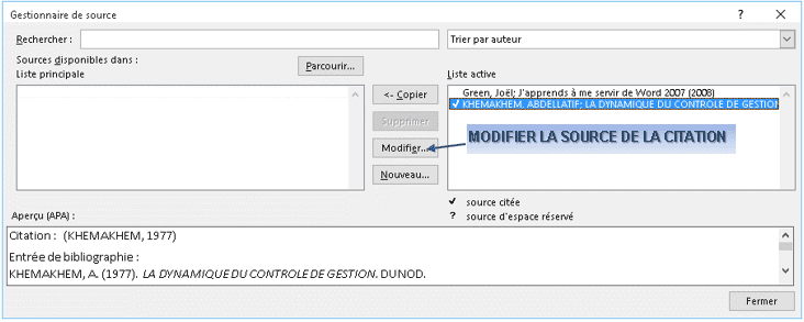 Les sources, c'est-à-dire les ouvrages auxquels il est fait référence, sont créées au fur et à mesure des besoins, sont stockées et peuvent être réutilisées.