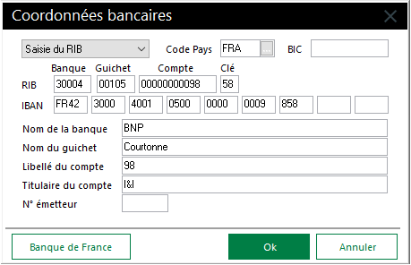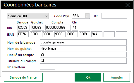 Dans la fenêtre d'établissement, vérifier l'existence de l'établissement principal comme ci-dessus, le compléter et lui rattacher les banques ci-dessous :