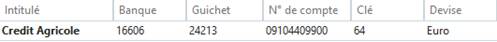 Banque : Credit Agricole 16606 24213 09104409900 64