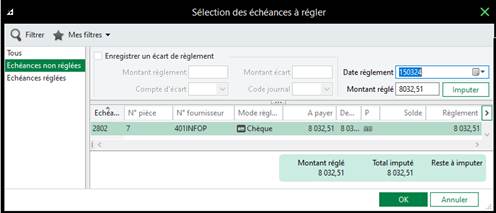 Imputer le règlement de "8032,5 €" à la facture "1" de "401INFOP"